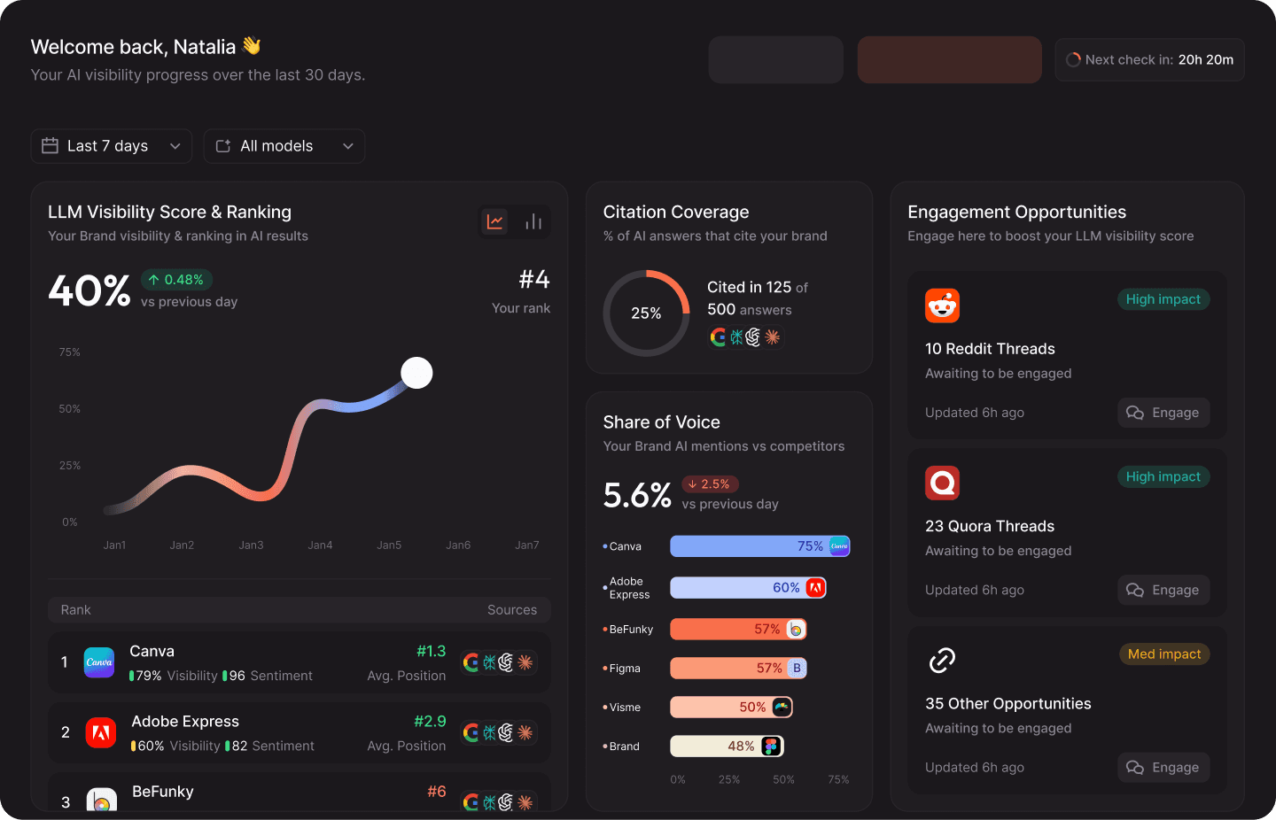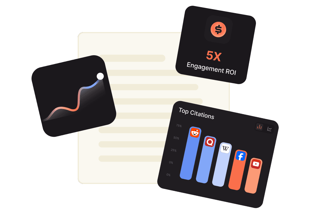 Track your AI search visibility. Engage where AI pulls its answers. Become the brand AI recommends.